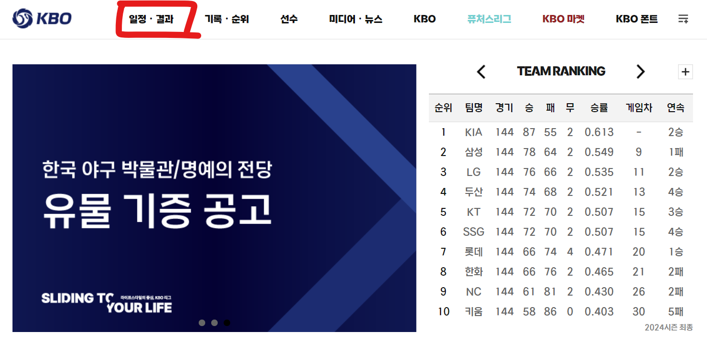KBO 공식홈페이지에 들어가시면 경기일정과 결과까지 한눈에 확인하실 수 있습니다. 물론 구단별로 경기일정까지 확인이 가능하니, 아래 홈페이지에서 자세한 일정 확인해 보시기 바랍니다.