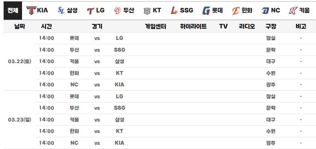| 3월 22일 14:00 | NC vs KIA | 광주 KIA 경기장 |